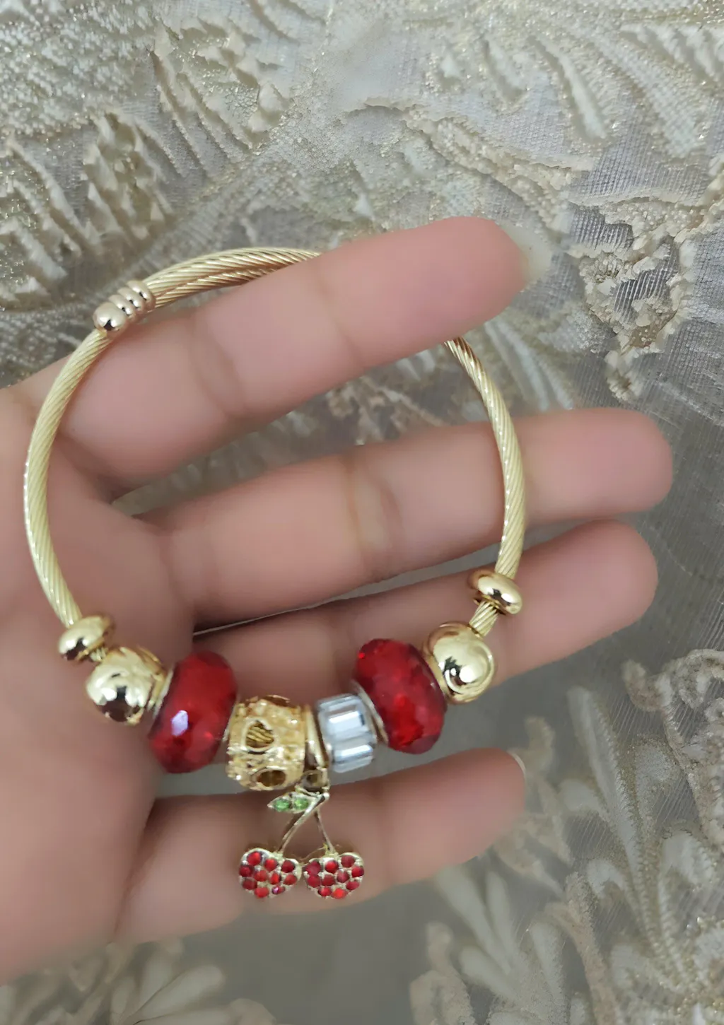 Hot New Bracelet Style Alloy & Stainless Steel Base | Gold Tone with Pearl & Red Cherry Accents Adjustable Fit | Romantic Love Charm Design