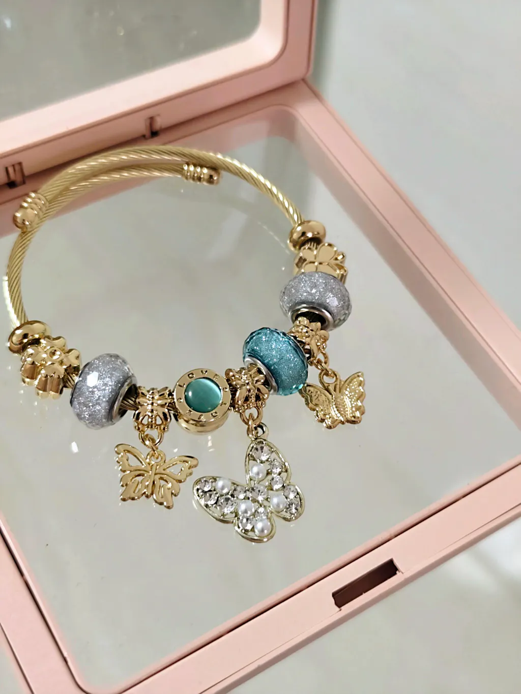 Discover the Laryne Golden Enchantment collection. Featuring stunning gold-tone cable bracelets with turquoise accents, crystal butterflies, and dainty pearl charms.