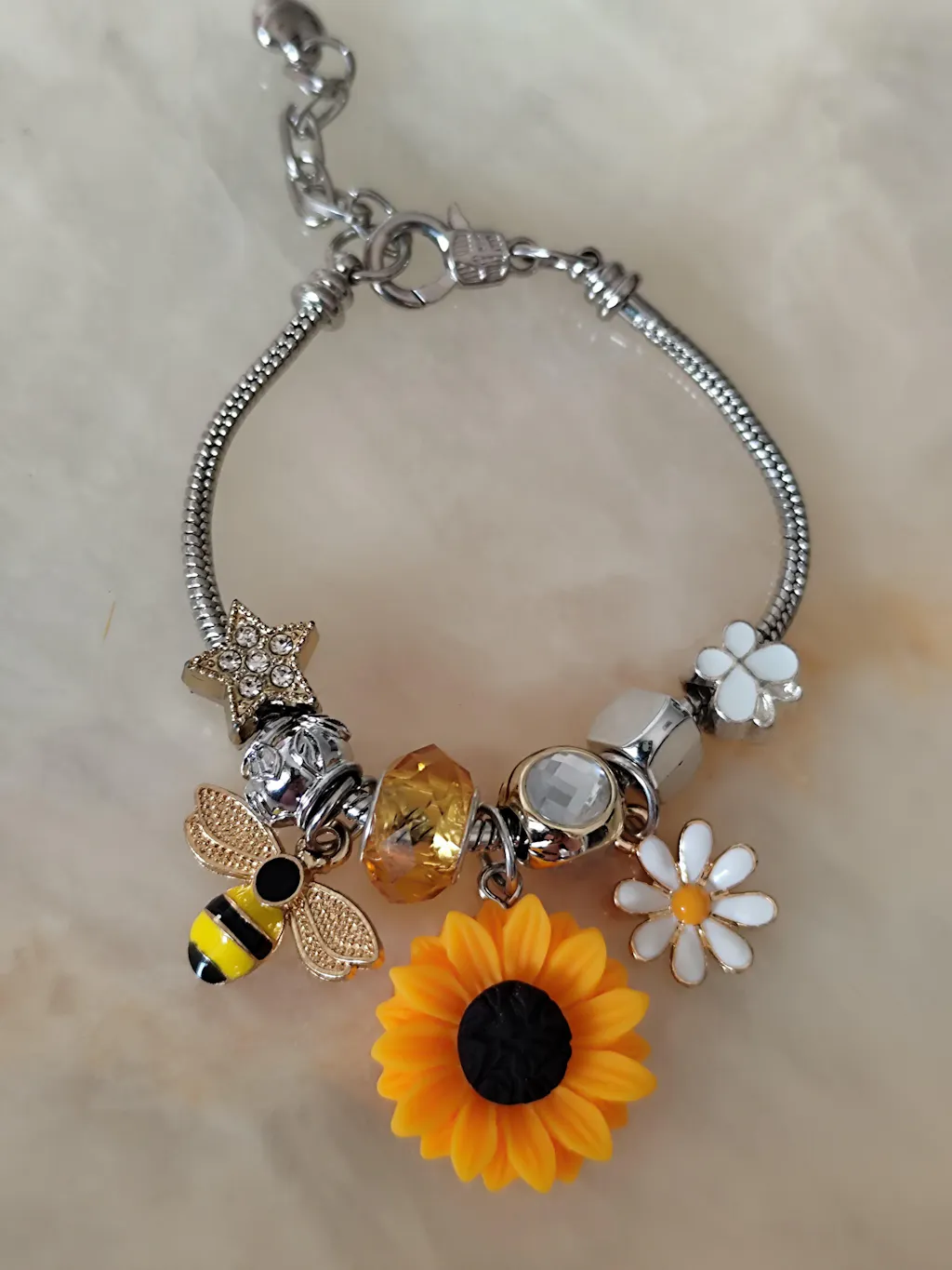 Sunflower & Honeybee Charm Bracelet – Silver Snake Chain with Daisy, Crystal & Gold Bee Accents – Nature-Inspired Floral Jewelry Gift for Women & Teens